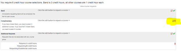 The screen below will direct you to make the request for complimentary courses for next year. Students need to select 6 credit hours of courses. Band (full year) is worth 2 credit hours, all other courses are 1 credit hour.