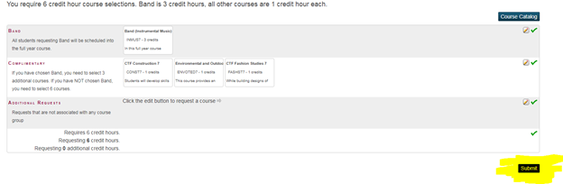 Once you have 4 green check marks on the main page, select submit. If you have not selected the full 6 hours you will be directed back to the selection pages to complete your choices.