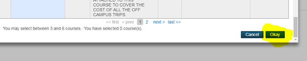 Once selections have been made, be sure to select OKAY to set them. Please note there are multiple pages of courses to select from – use the blue links at the bottom of the page to navigate to the next pages.