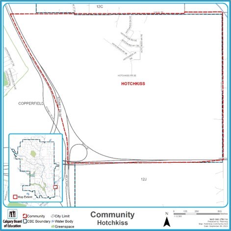 The community of Hotchkiss is in the southeast planning sector of the city between Stoney Trail SE and 104 Street SE. (see map on the back of this notice). Hotchkiss development will accommodate approximately 5,000 people and will be built out over the next 15 to 20 years. The Calgary Board of Education (CBE) would like to advise of the following school designations for students residing in the community of Hotchkiss.